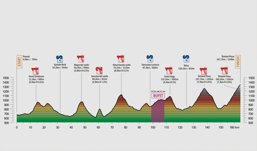 Už druhá etapa bude tou najťažšou v celom itinerári pretekov. 164 kilometrov dlhá trať bude viesť z Popradu na Štrbské pleso. Na trati je situovaných sedem hodnotených stúpaní. Štrbské pleso budú jazdci prekonávať až dvakrát. Prvý 7,3 kilometrov dlhý výstup bude skrátený.