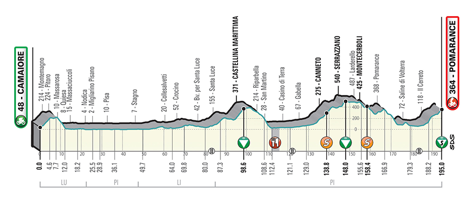 Sedemdňové etapové preteky na talianskych cestách odštartovali dnes tímovou časovkou v daždivom počasí. Cieľ s najrýchlejším časom na mokrej trati preťal tím Mitchetlon – Scott, vo víťaznom čase 22 minút a 25 sekúnd.