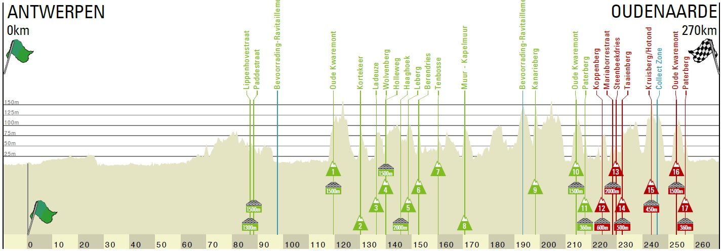 Favoriti na triumf sa budú musieť pohybovať na čele pretekov. Na týchto úsekoch budeme môcť očakávať prvé ataky. Kým sa pelotón opäť vráti k legendárnym Oude Kwaremont a Paterberg, bude prekonávať ešte päť kockových úsekov.