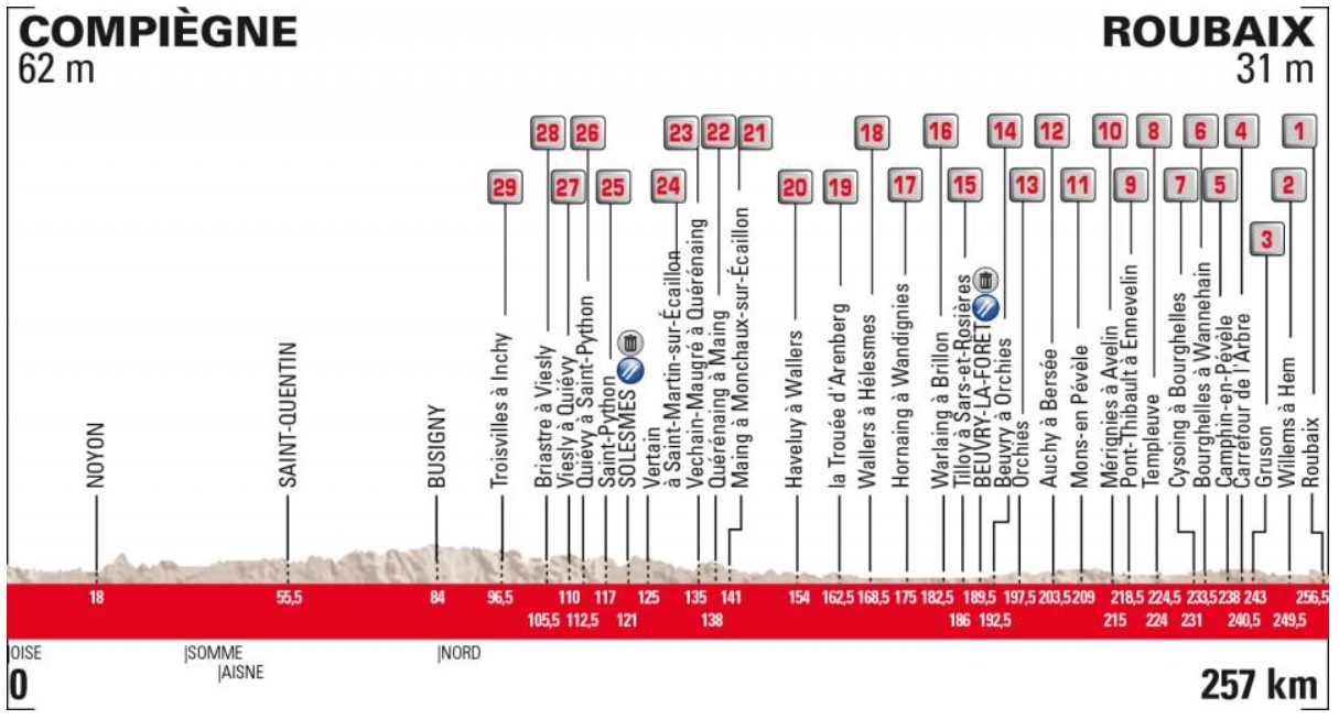 Mačacie hlavy preveria tých najskúsenejších jazdcov a favoriti budú musieť takmer počas celého dňa jazdiť na čele balíka. Aj napriek tomu, že pelotón už bude mať za sebou niekoľko pavé úsekov, tým najdôležitejším bude prejazd cez Arenberský les. Hoci je situovaný 95 kilometrov pred cieľom, práve tento päťhviezdičkový úsek preverí silu všetkých favoritov.